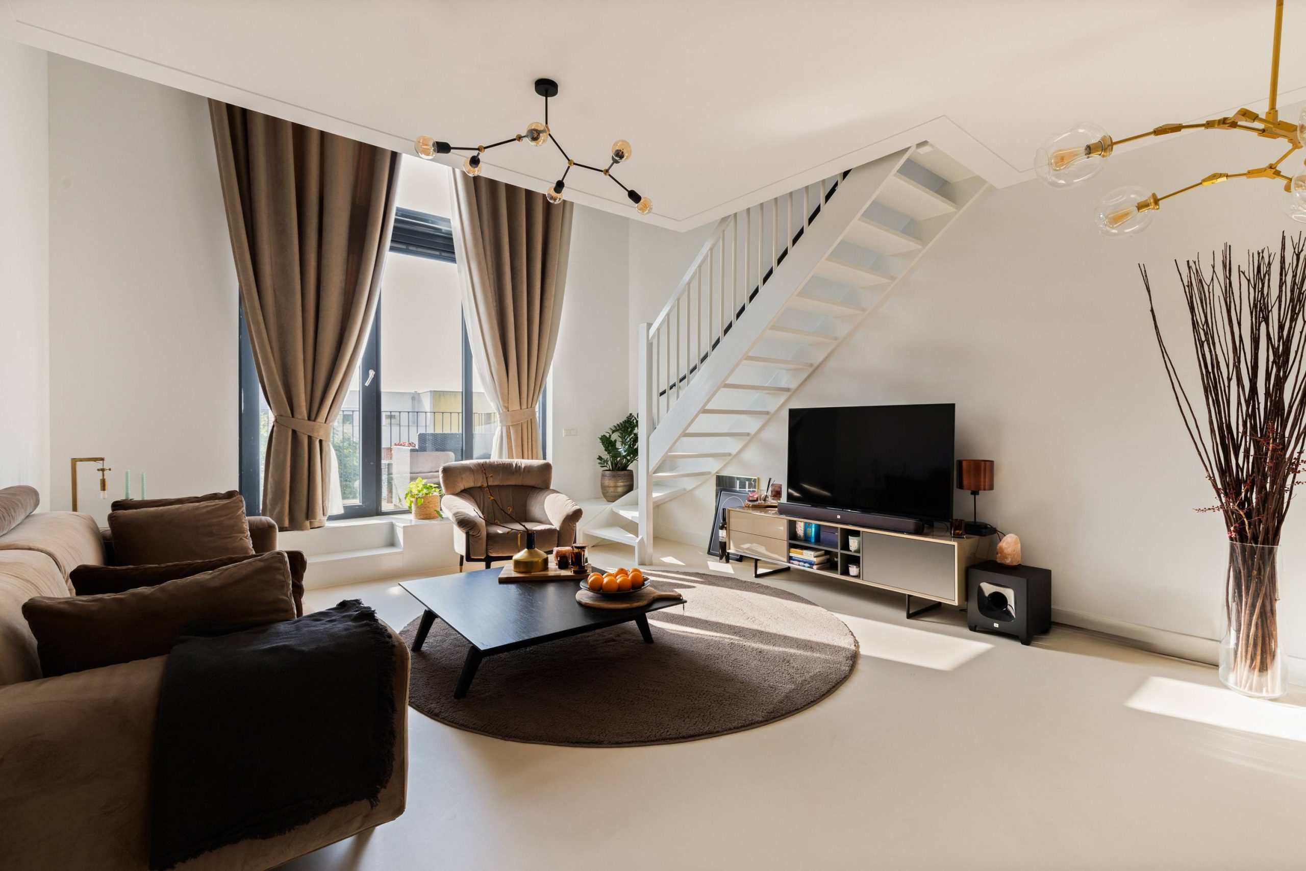 De woonkamer strekt zich uit over de volledige breedte van het appartement en is een echte eyecatcher. Aan de voorzijde zorgen de dubbele raampartijen, dankzij de vide tot aan de bovenverdieping, voor een indrukwekkende lichtinval en ruimtelijk gevoel. Voor de ramen bevindt zich een sfeervol houten plateau met toegang tot het ruime balkon, dat een fraai uitzicht biedt over het water. Via de witte trap bereik je de bovengelegen verdieping, een open ruimte die geheel naar eigen wens kan worden ingericht.