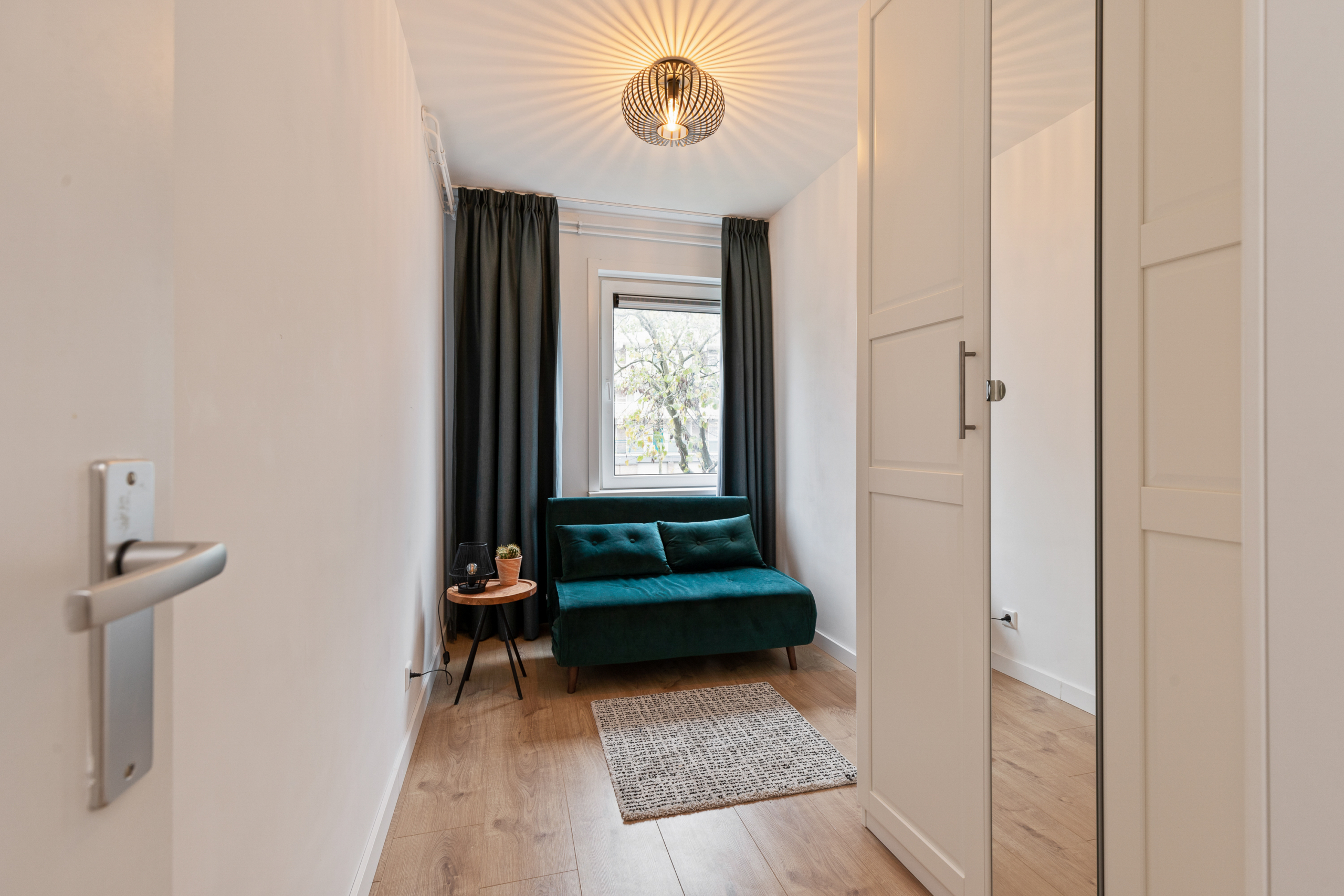 Het appartement beschikt over twee ruime slaapkamers. De master bedroom is comfortabel en rustig gelegen. De tweede slaapkamer is ingericht met een slaapbank en kledingkast en is daarmee flexibel te gebruiken als logeerkamer, werkkamer of extra slaapkamer.
