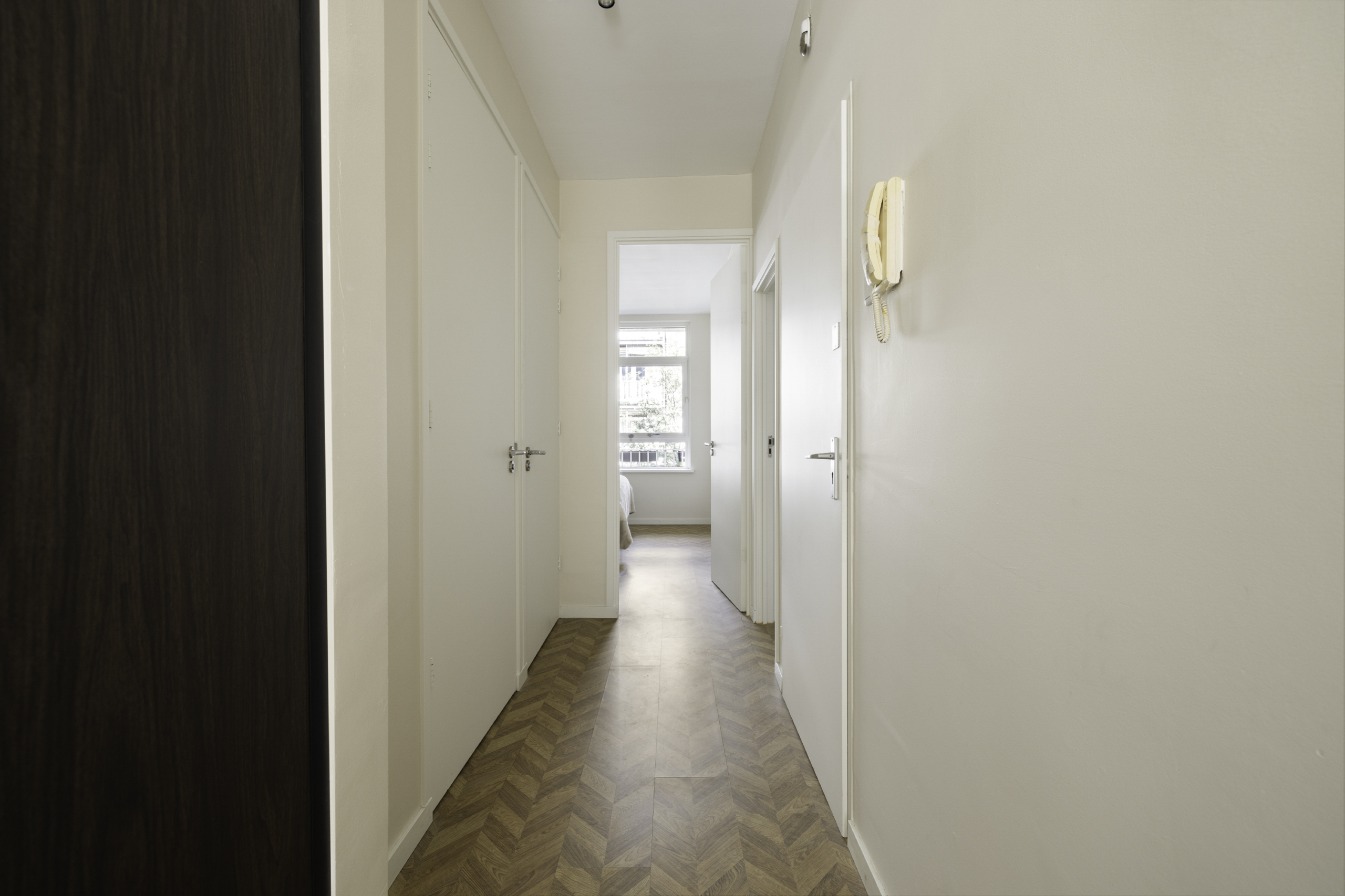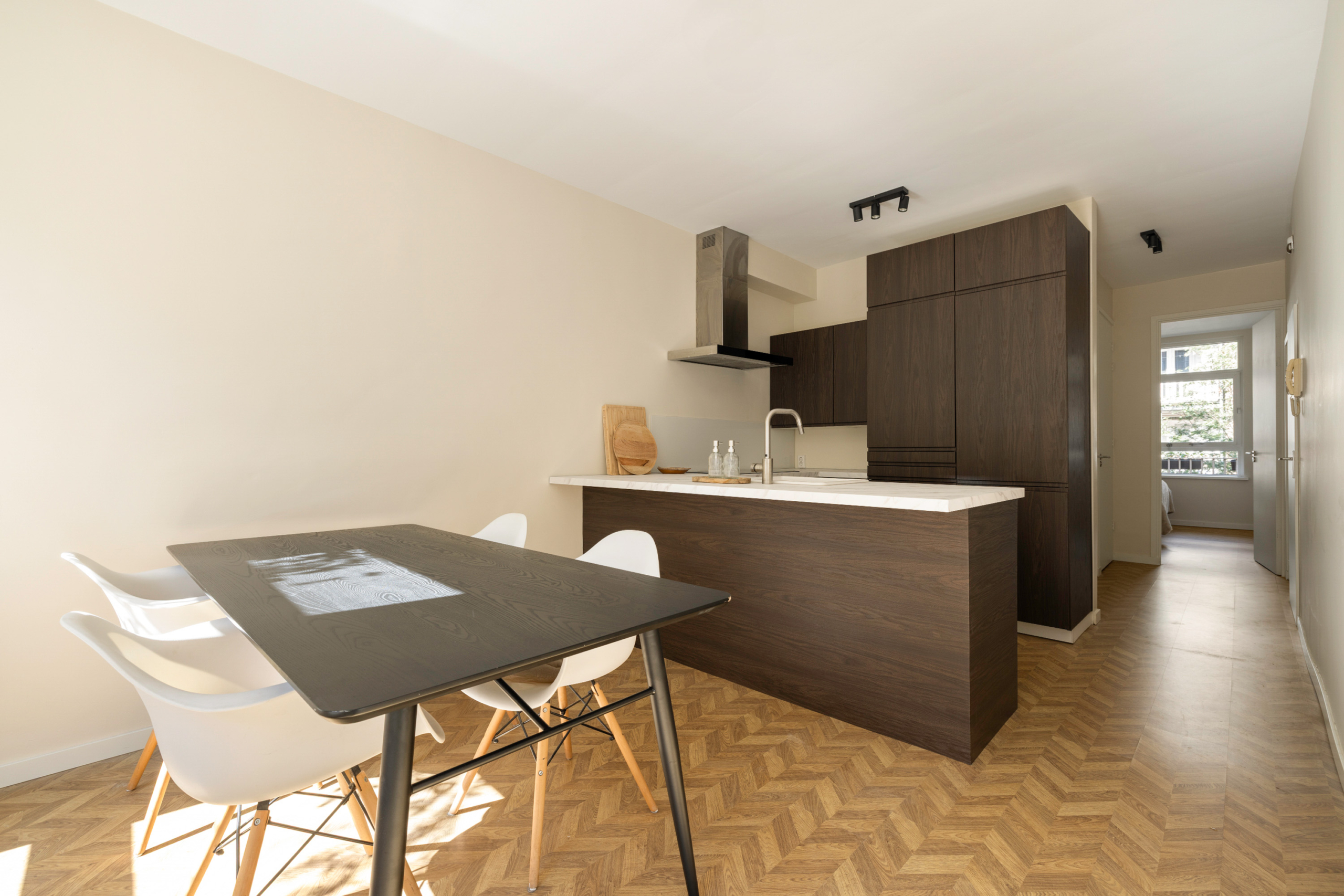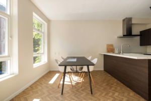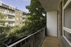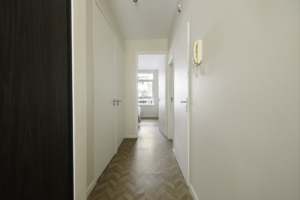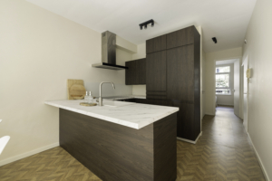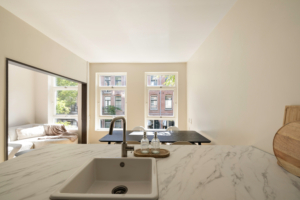 Het appartement ligt op de eerste verdieping van een karakteristiek pand met een verzorgd trappenhuis. Via de entree kom je binnen in de hal, die toegang biedt tot de verschillende vertrekken. De lichte woonkamer met grote ramen geeft een ruimtelijk gevoel en kijkt uit over de sfeervolle straat. De moderne open keuken met schiereiland is voorzien van inbouwapparatuur en sluit naadloos aan op de woonkamer.