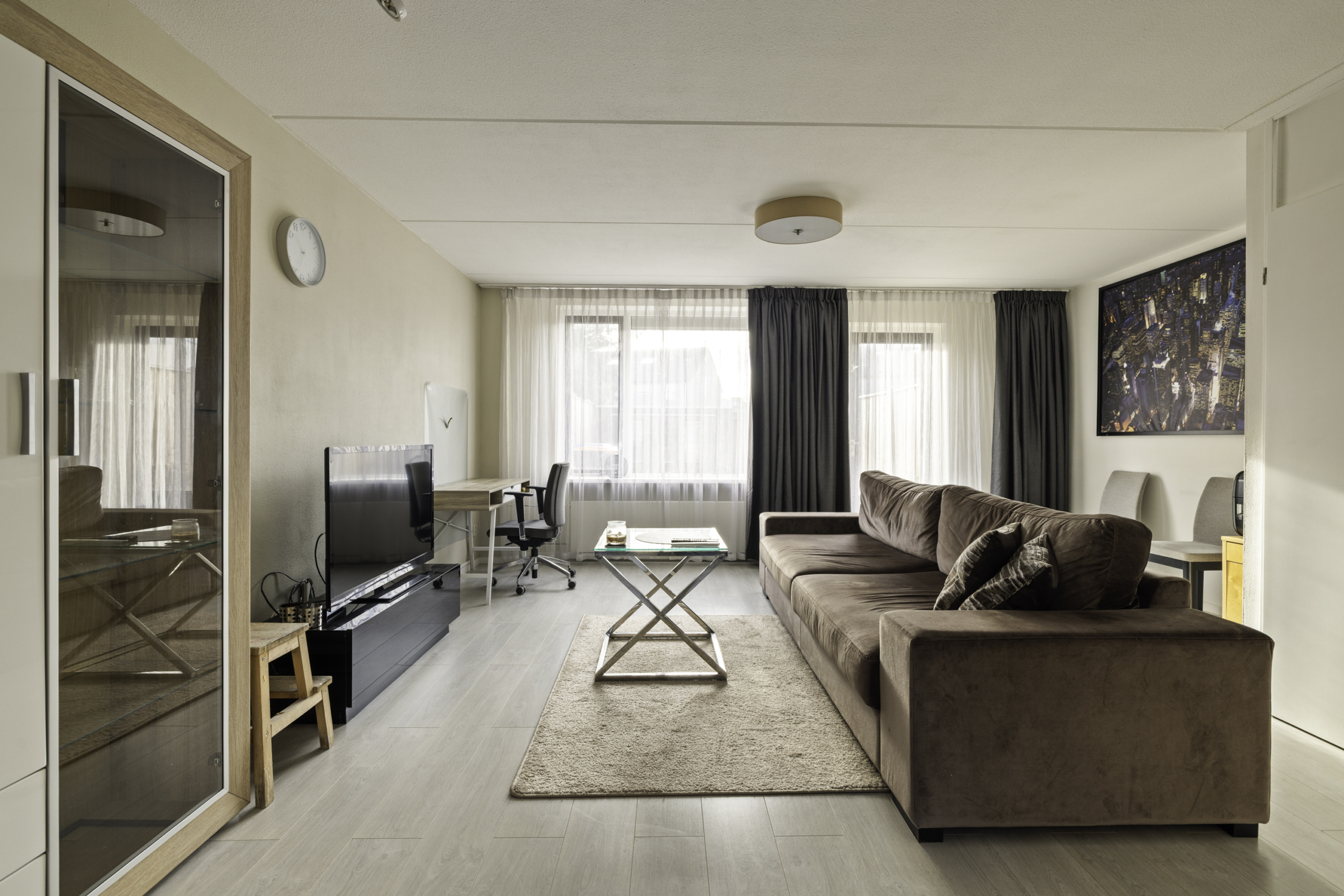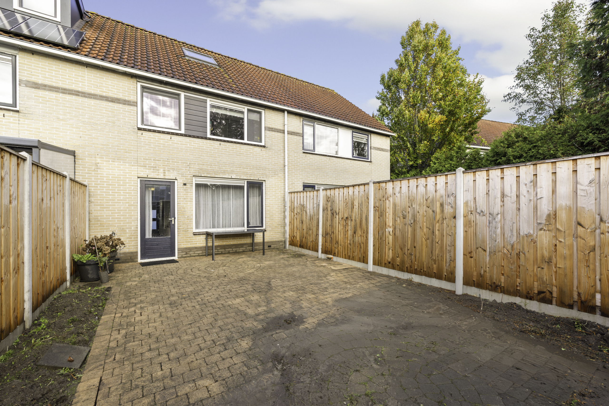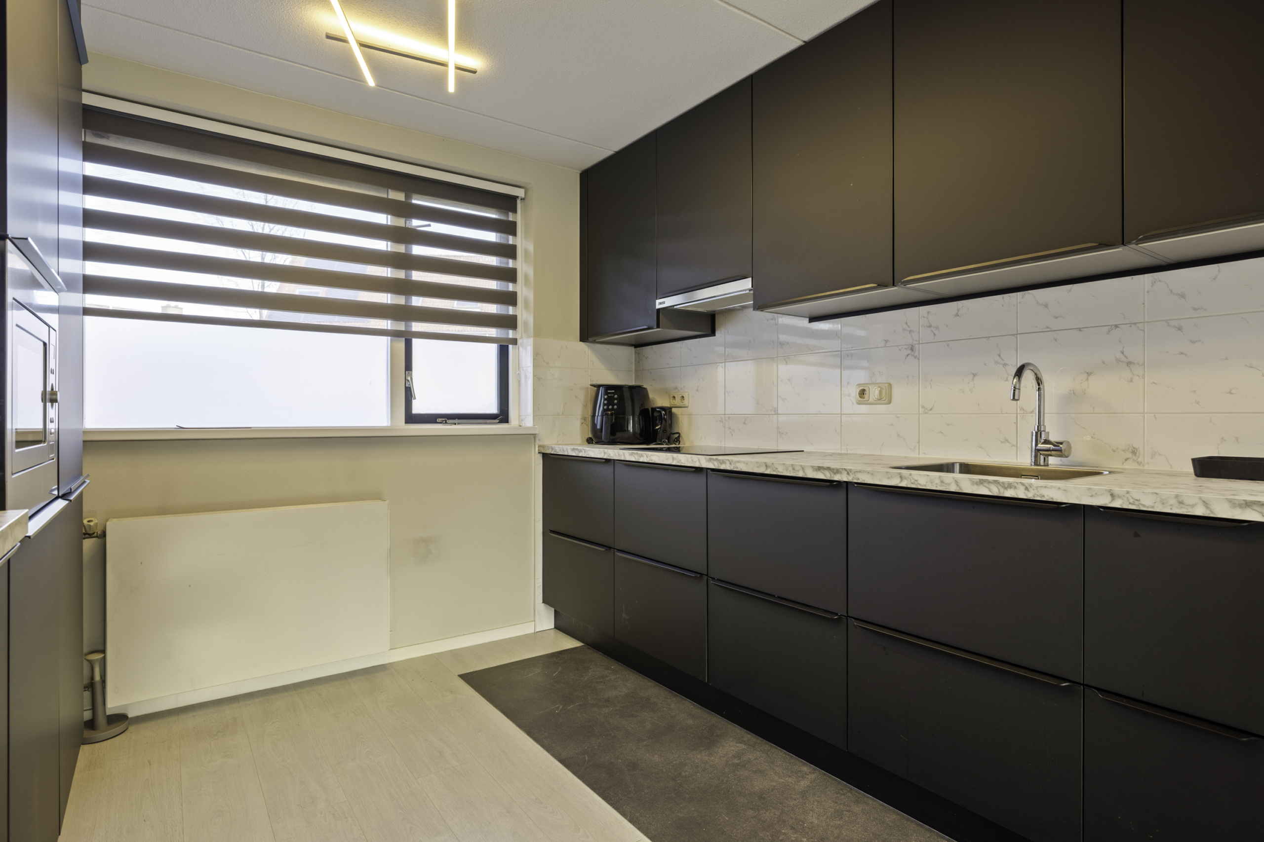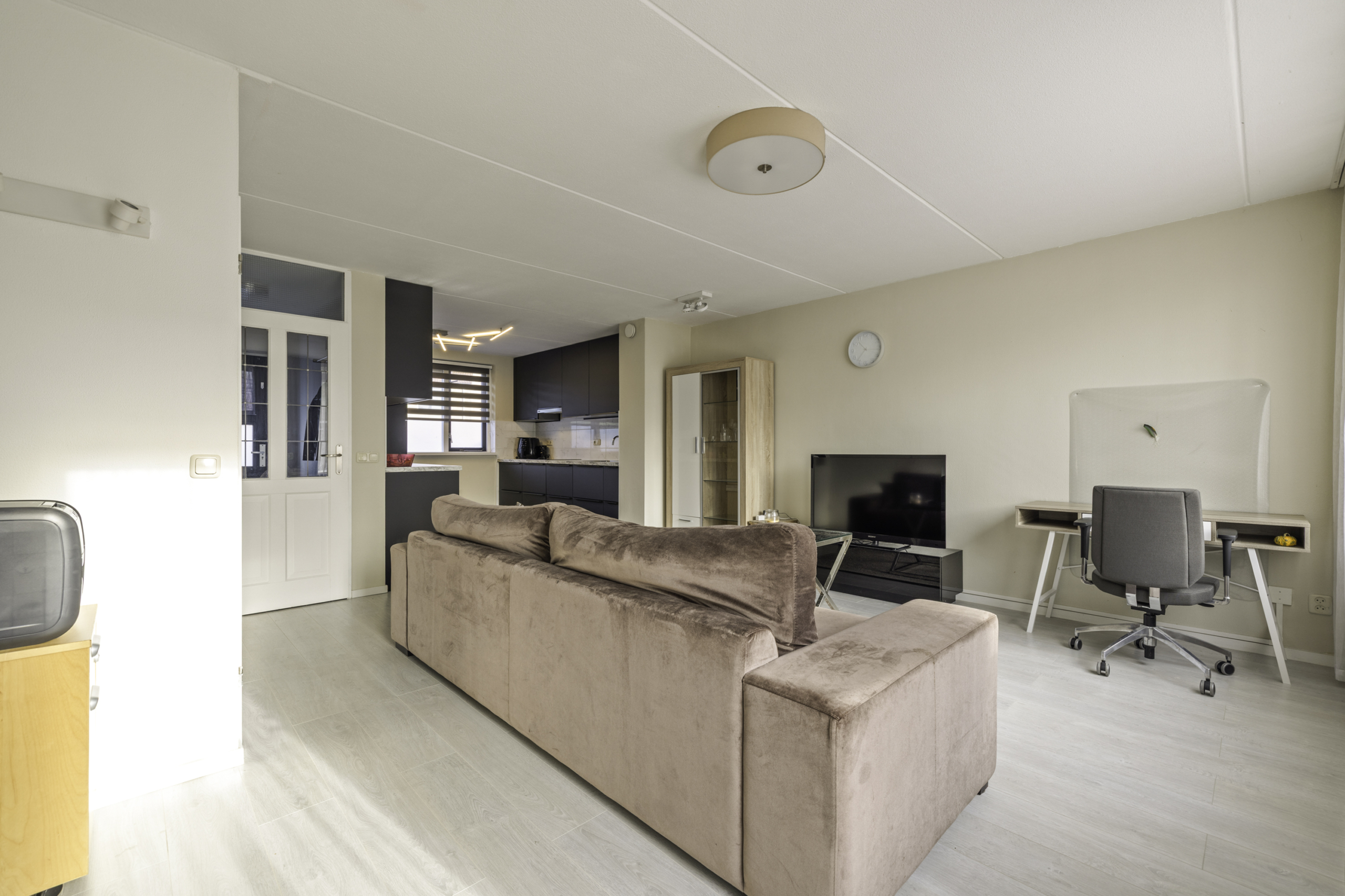 Bij binnenkomst valt meteen de lichte en open indeling op. De woonkamer is warm ingericht met een comfortabele zithoek en eethoek, en biedt directe toegang tot de ruime achtertuin van circa 45 m². De moderne keuken is voorzien van diverse inbouwapparatuur en beschikt over voldoende kastruimte.
