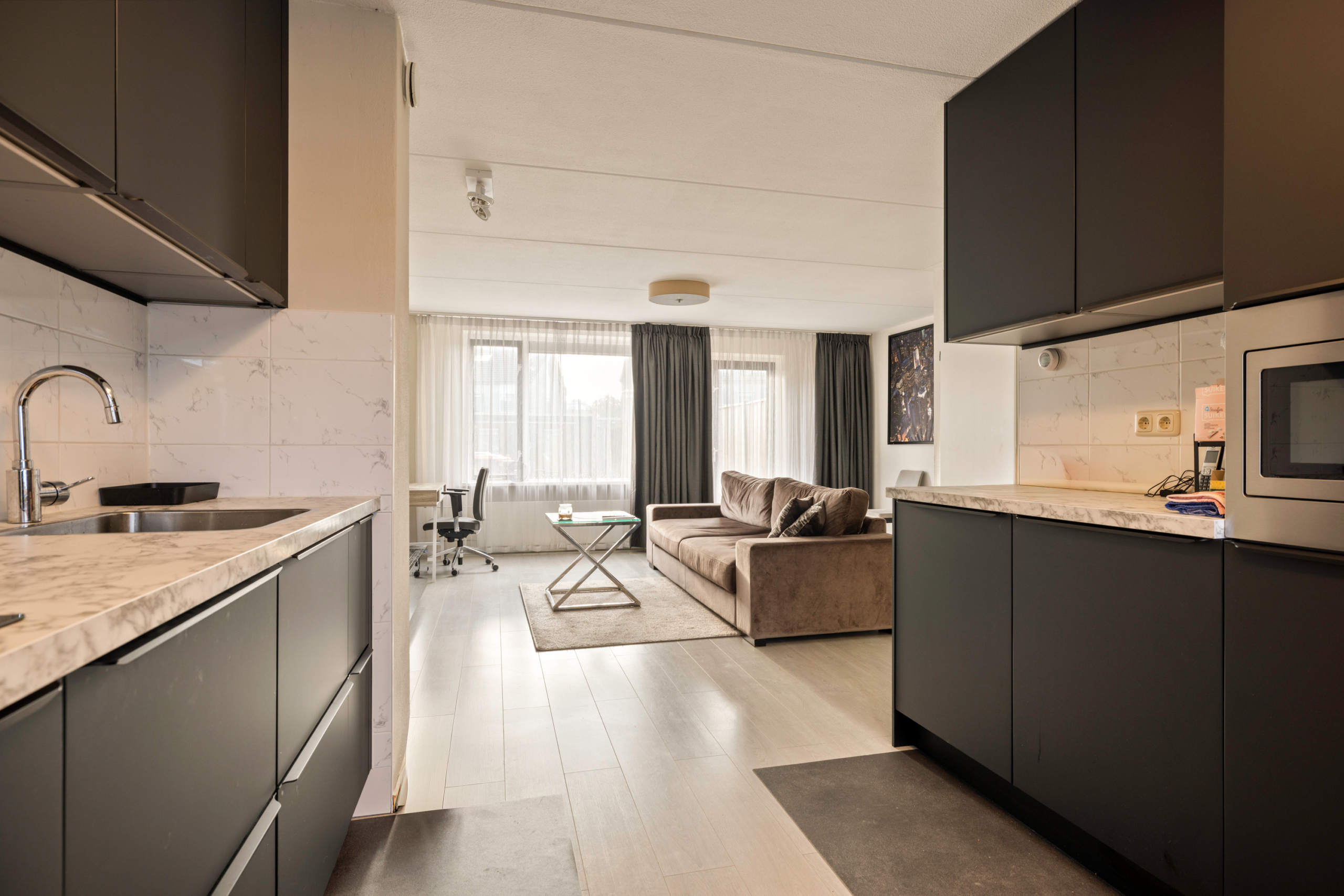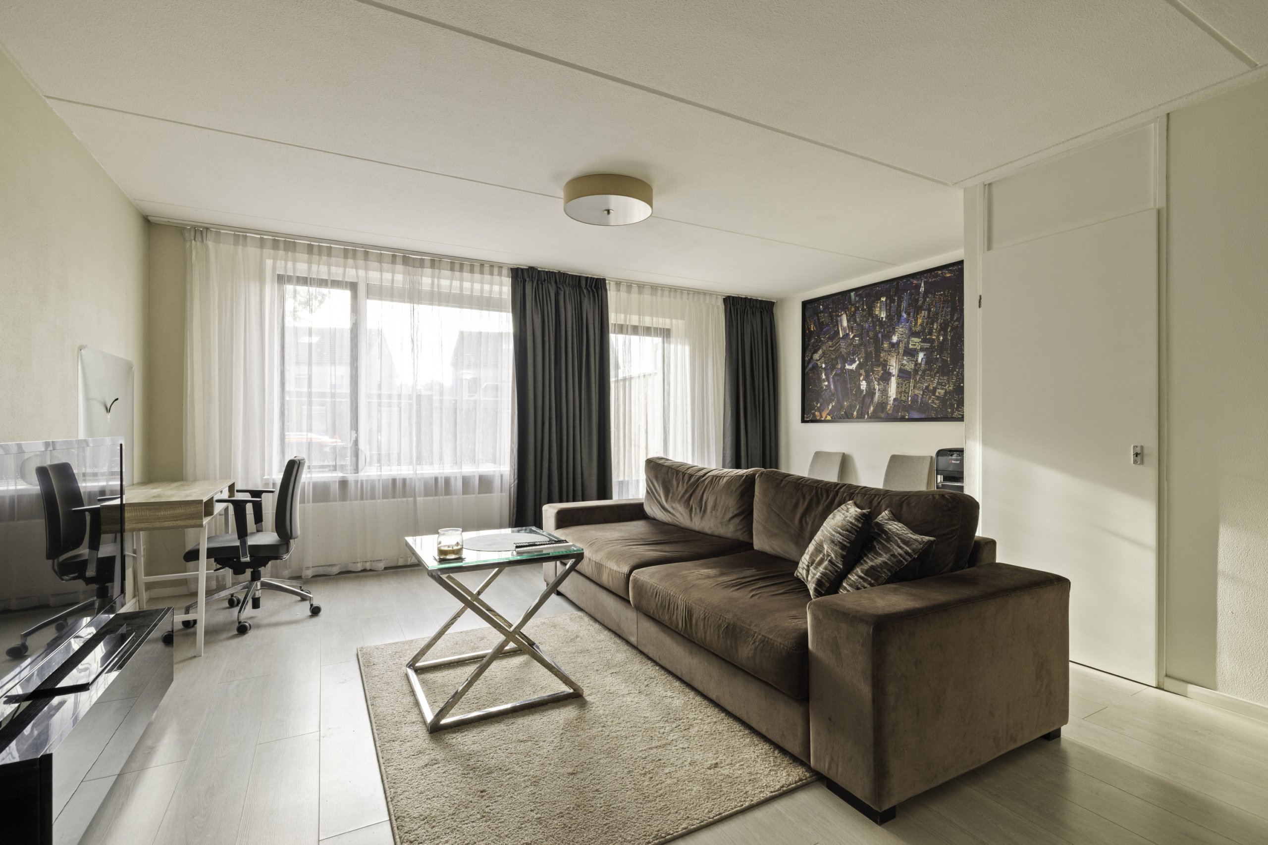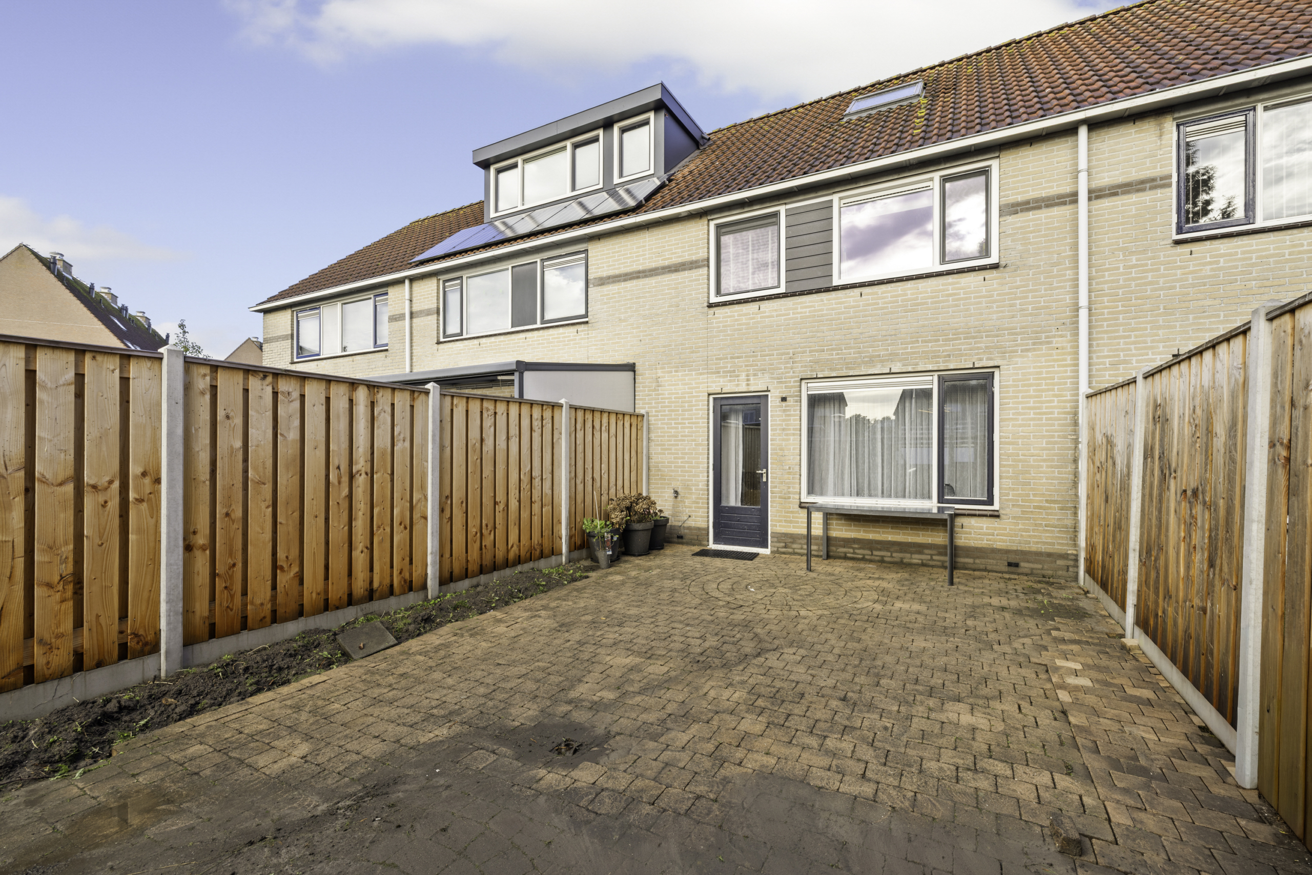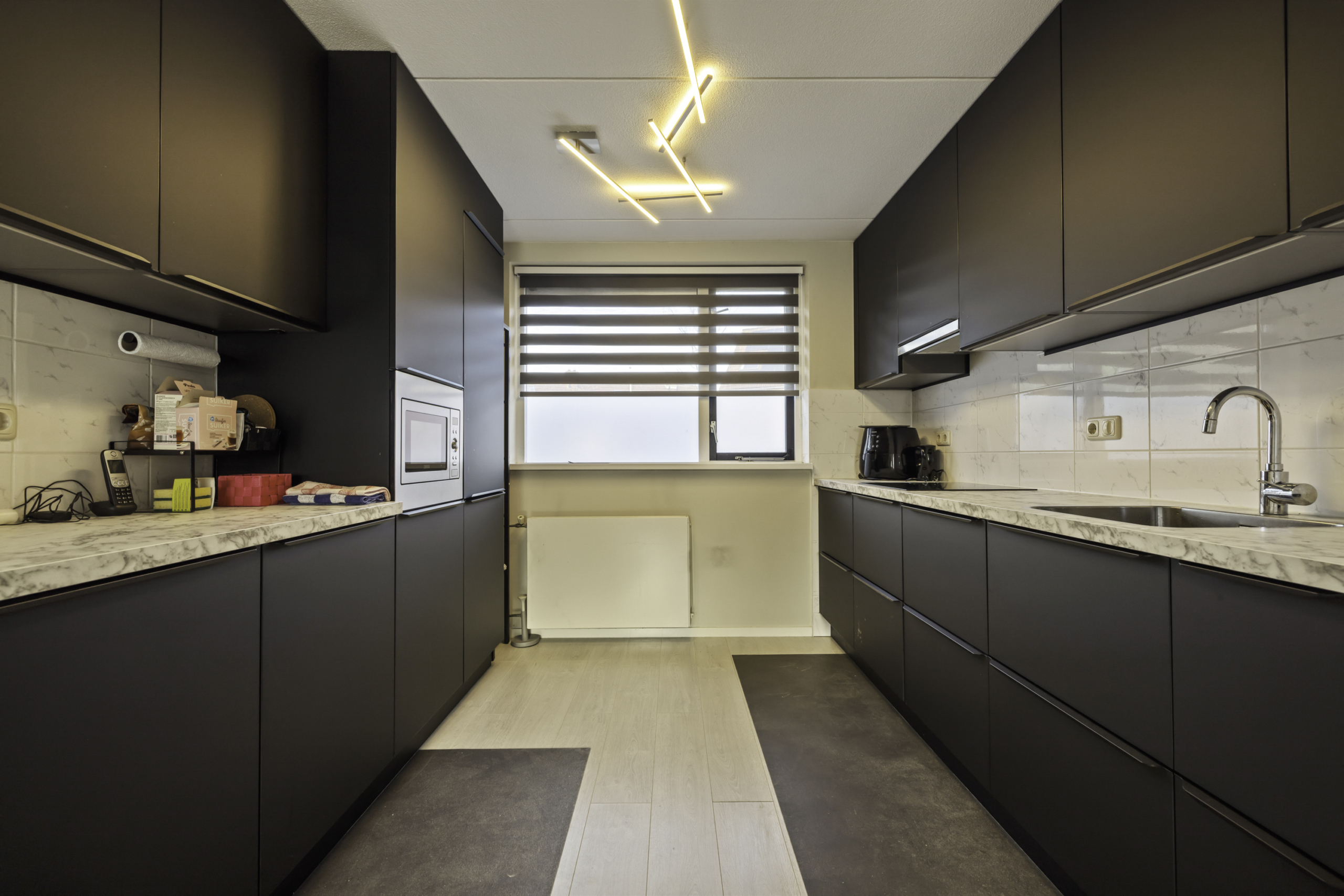 Bij binnenkomst valt meteen de lichte en open indeling op. De woonkamer is warm ingericht met een comfortabele zithoek en eethoek, en biedt directe toegang tot de ruime achtertuin van circa 45 m². De moderne keuken is voorzien van diverse inbouwapparatuur en beschikt over voldoende kastruimte.