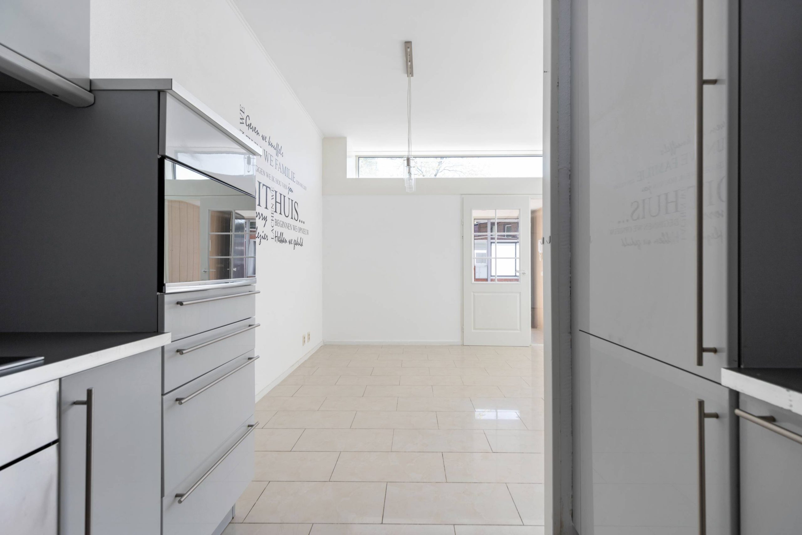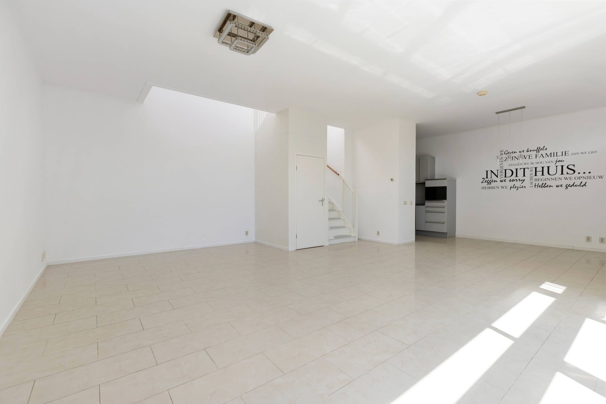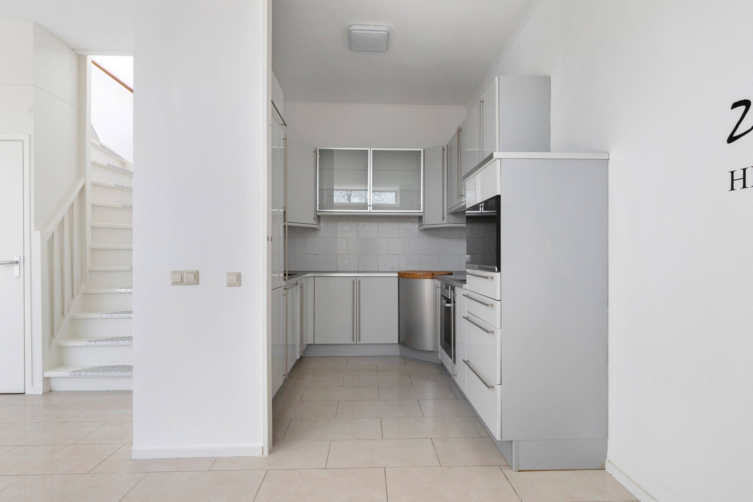 Via de entree bereikt u de ruime en lichte woonkamer met hoge plafonds en grote raampartijen, wat zorgt voor een aangename hoeveelheid daglicht. De moderne halfopen keuken is volledig uitgerust met inbouwapparatuur en vormt een prettig geheel met de leefruimte.