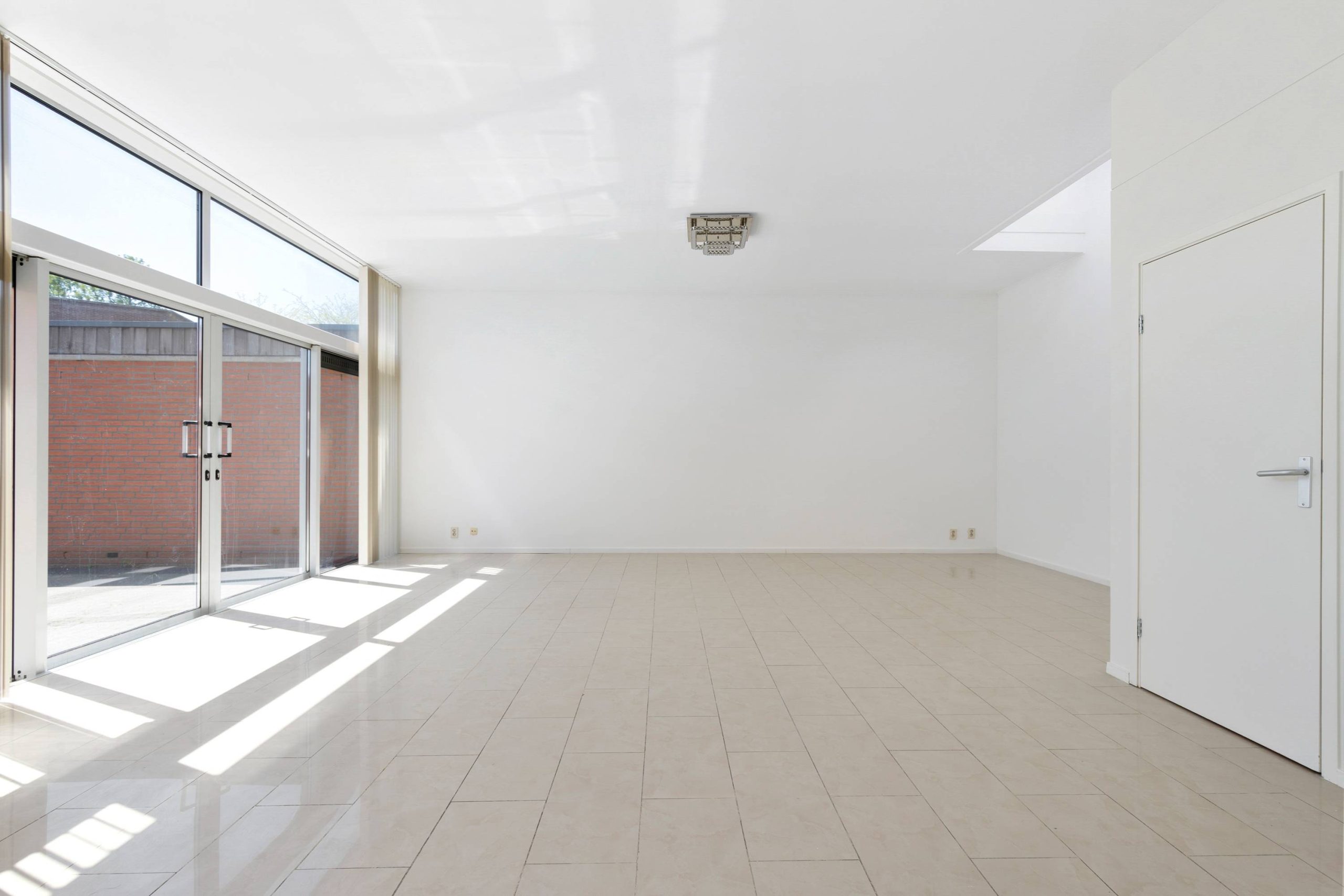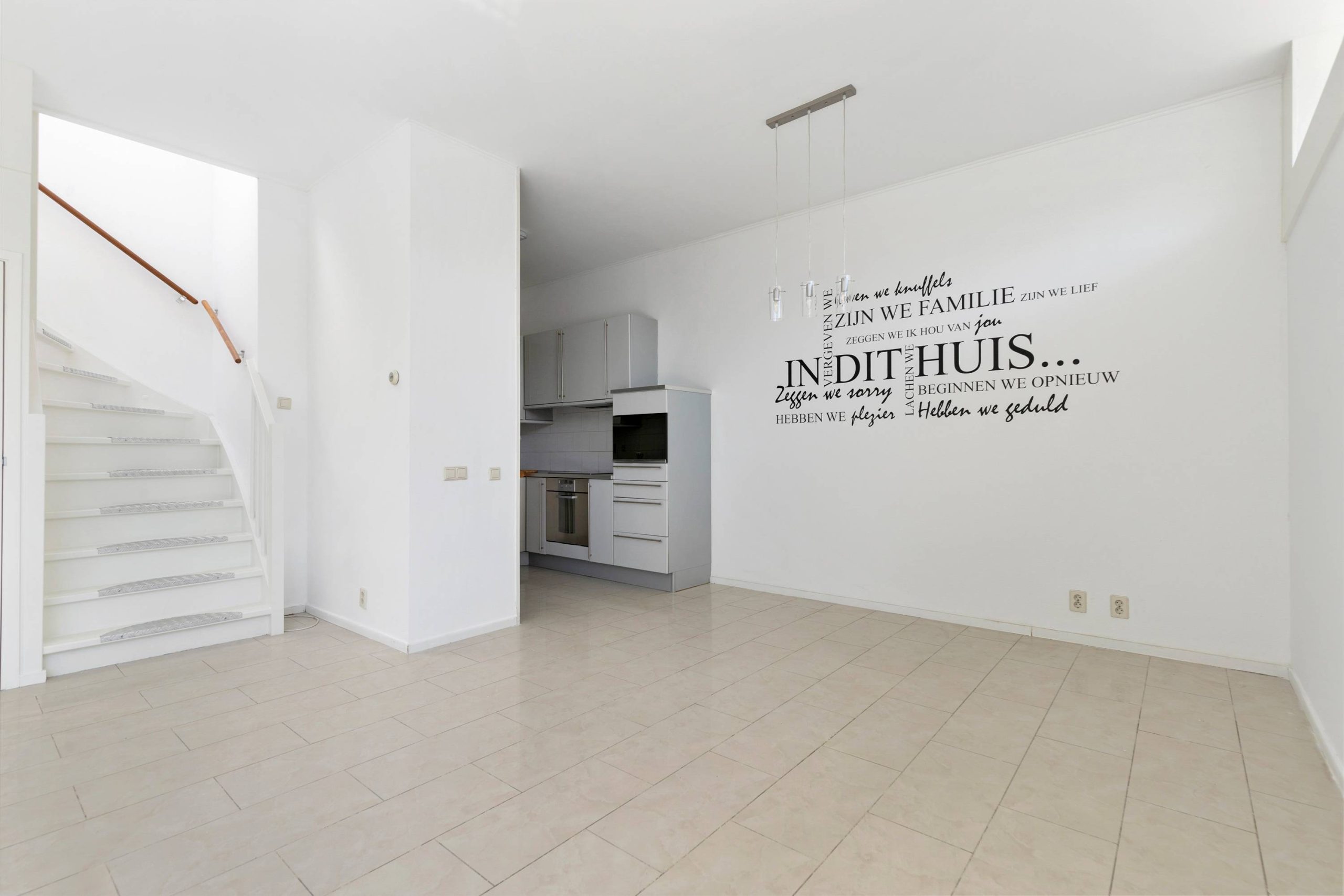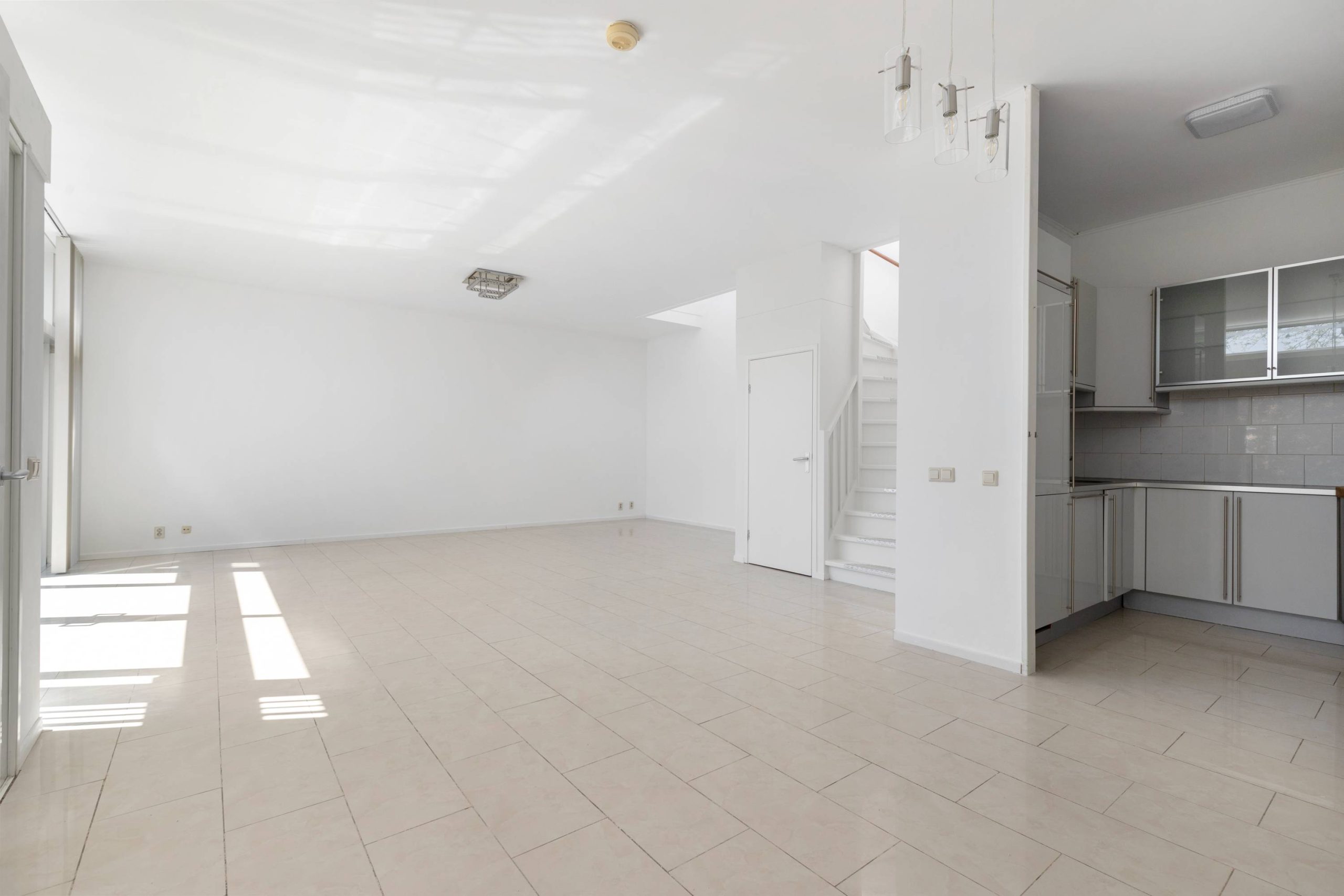 Via de entree bereikt u de ruime en lichte woonkamer met hoge plafonds en grote raampartijen, wat zorgt voor een aangename hoeveelheid daglicht. De moderne halfopen keuken is volledig uitgerust met inbouwapparatuur en vormt een prettig geheel met de leefruimte.