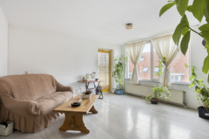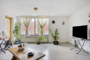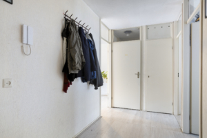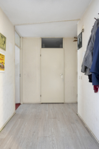 U betreedt de woning via de gezamenlijke entree aan de straatzijde. De trap brengt u naar de woning, waar u via de voordeur de lichte hal binnenstapt. Deze centrale ruimte vormt het startpunt van het appartement en geeft toegang tot alle vertrekken.Woonkamer