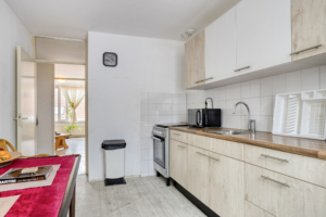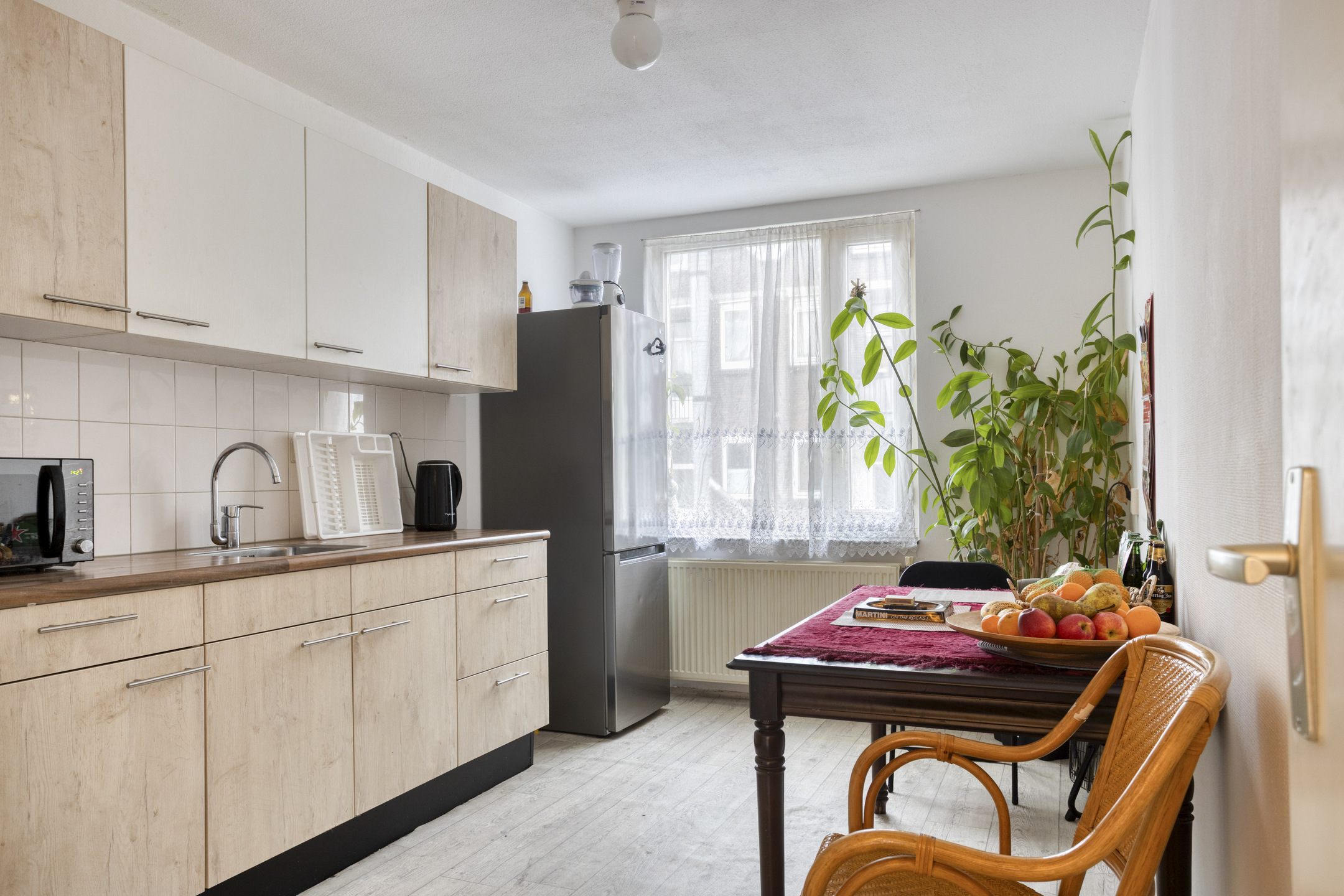 De woonkamer vormt het middelpunt van de woning. Dankzij de grote raampartijen baadt de ruimte in het daglicht, waardoor de kamer ruim en luchtig aanvoelt. Hier creëert u moeiteloos een comfortabele zithoek én een gezellige eethoek, passend bij uw leefstijl. De ramen zorgen voor een open sfeer. Vanuit de woonkamer heeft u tevens toegang tot het balkon, wat een fijne verlenging van de leefruimte is en een ideale plek om te ontspannen of gasten te ontvangen.Keuken