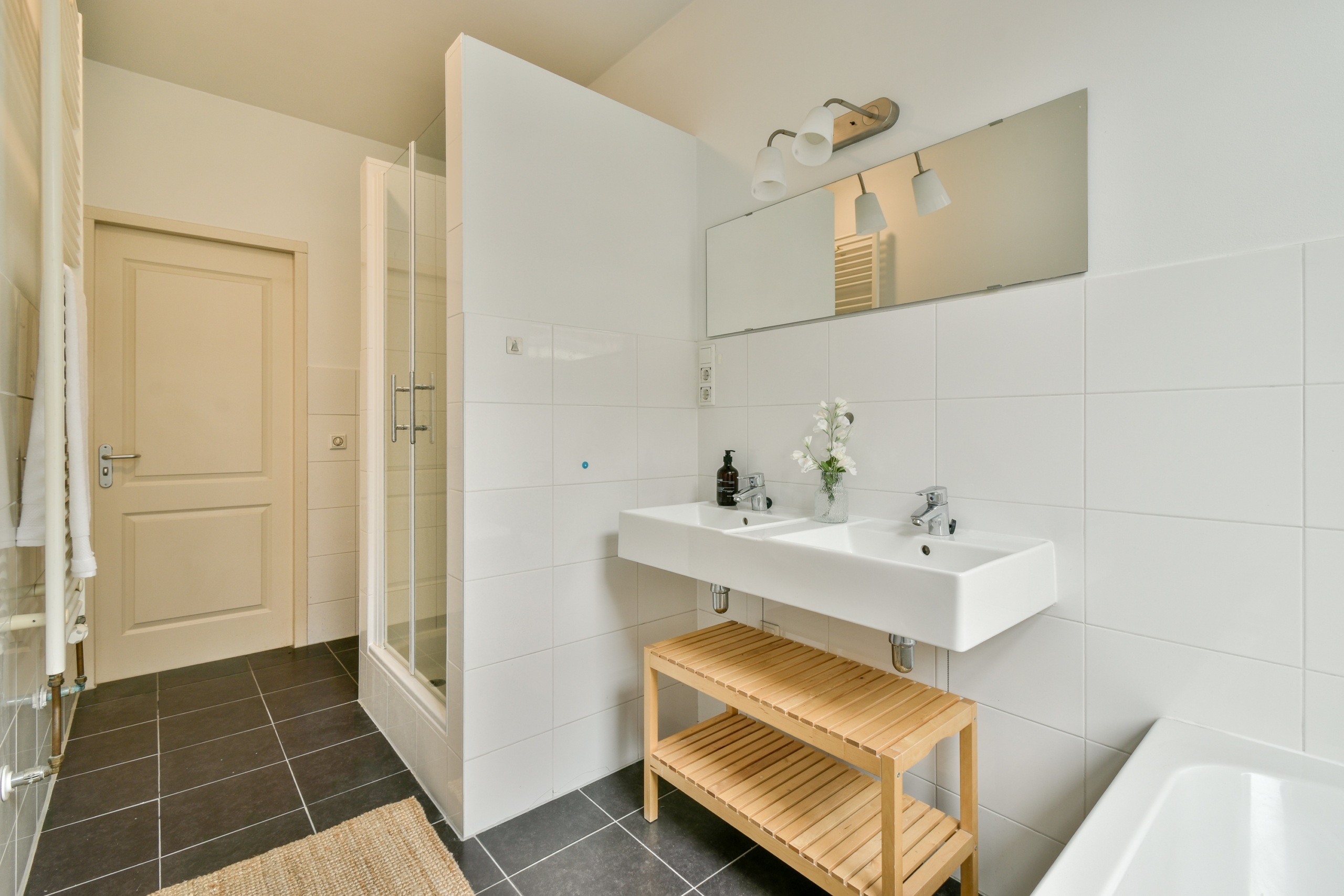 - Twee badkamers: één met douche en wastafel, tweede met douche, ligbad, dubbele wastafel en toilet